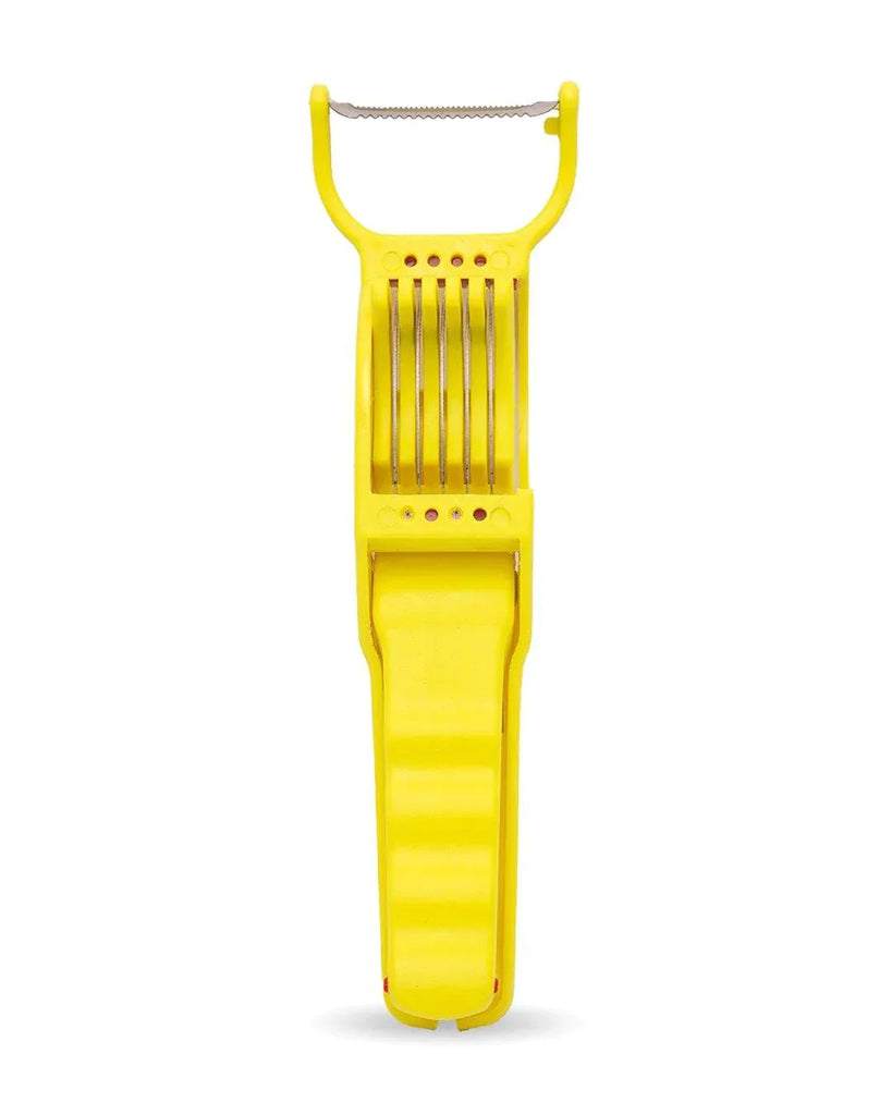 Featuring extra-sharp stainless steel blades, the Famous multi cutter with peeler makes easy work of cutting vegetables and fruits for various purposes. With its smart design, you simply have to press the cutter along its ergonomic handle to obtain neatly cut vegetables, thus keeping your hands safe.