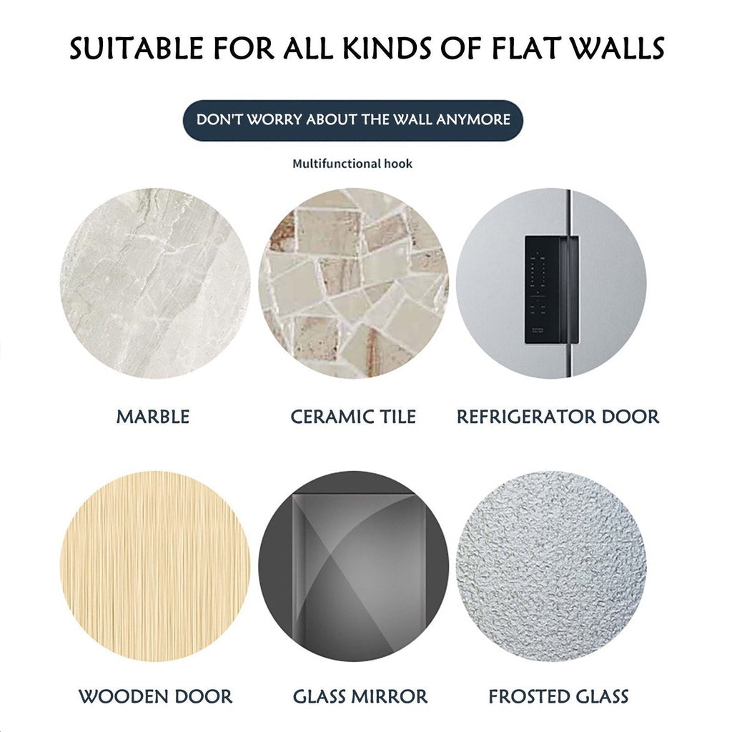 This adhesive hanging hook is super versatile which is suitable to use in various scenes in kitchen/bathroom. It can work on Smooth ceramic tile, mirror, flat stainless steel, acrylic, plastic, laminate base and more. Attention - There are limits on painted walls.