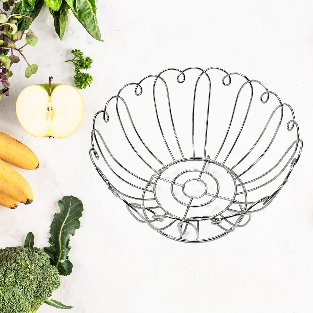 • STYLISH DESIGN - Made using durable iron, and chrome plated to provide a strong body that will complement most decors, features an antiqued style finish. This chrome fruit basket will make a contemporary and chic centerpiece on your table while providing an excellent way to store your fresh fruit.