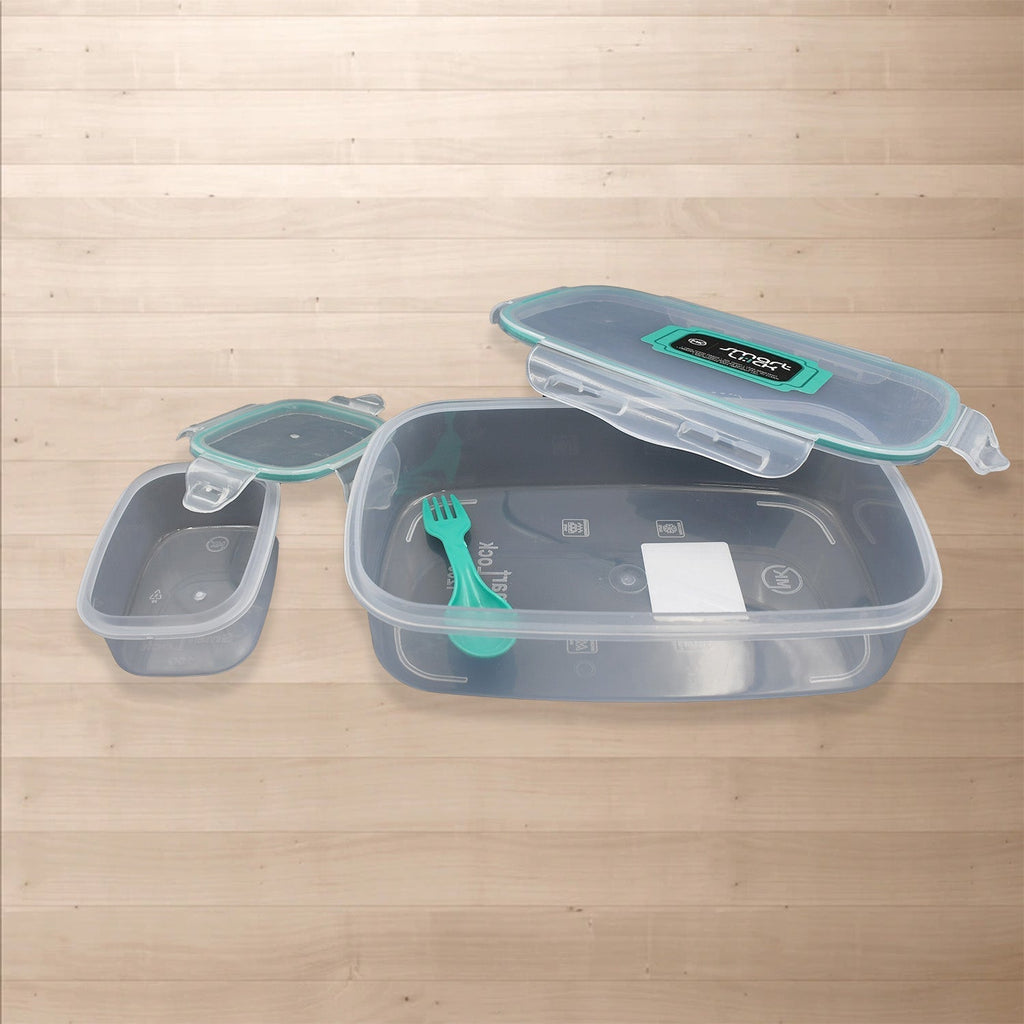 5896 Multipurpose Air Tight 4 Side Lock Food Grade Lunch Box With Small Square Container & Spoon, Smart Transparent Tiffin Lunch Box